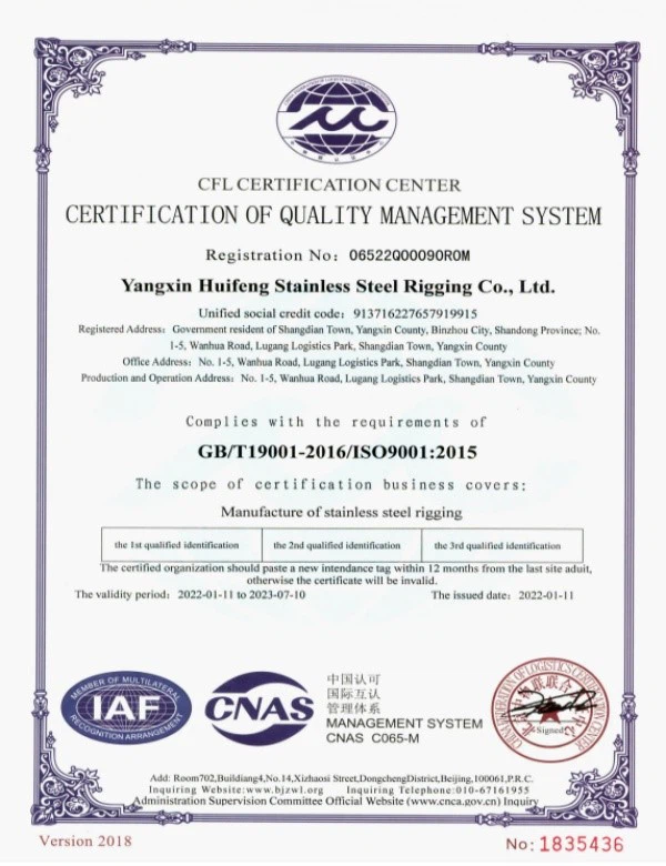 Huifeng Rigging legt großen Wert auf technologische Innovation und Produktqualität. Das Unternehmen hält über 30 inländische Patente für Produktdesigns und Versorgungsmodelle sowie 5 US -Design -Patente. Darüber hinaus ist die Huifeng -Rigging unter dem Qualitätsmanagementsystem von GB / T 19001-2016 / ISO9001: 2015 zertifiziert, wobei das Vertrauen für seine konsistente Produktqualität einbringt.